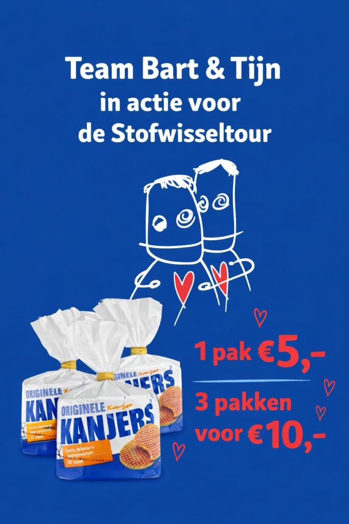 Vanuit Team Bart en Tijn willen we natuurlijk ook een bijdrage leveren aan het doel van de Stofwisseltour. Het team heeft de afgelopen weken via social media een te gekke stroopwafelactie gehouden: 3 heerlijke pakken Kanjer stroopwafels voor slechts € 10.=.